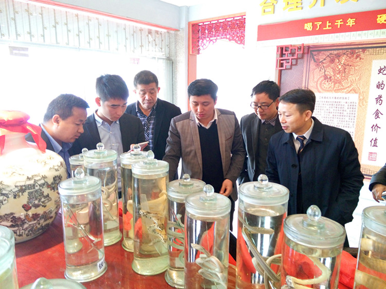 公司總經(jīng)理郭德志向湖南發(fā)展研究中心領導介紹蛇酒釀泡方法