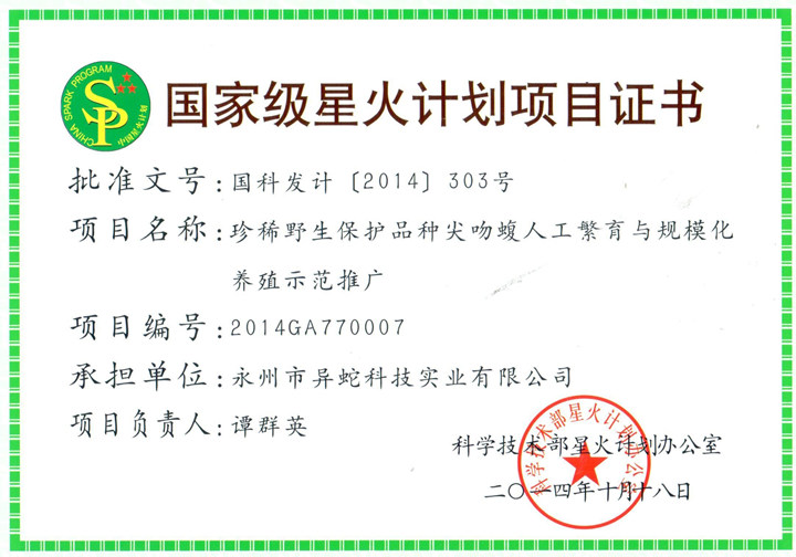 永州市異蛇科技實業(yè)有限公司《珍稀野生保護動物品種尖吻蝮人工繁育與規(guī);B(yǎng)殖示范推廣》項目被列入國家級星火計劃,該技術與2015年獲得了湖南省科技進步二等獎,填補了國內(nèi)尖吻蝮蛇人工繁養(yǎng)技術空白。