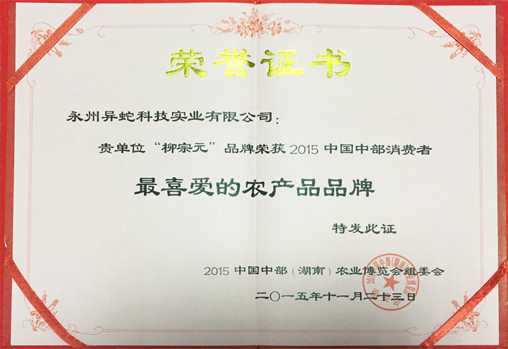 會上,2015中國中部(湖南)國際農(nóng)業(yè)博覽會參展產(chǎn)品金獎評選揭曉,經(jīng)組委會產(chǎn)品評審委員會評審,柳宗元異蛇王酒喜獲“中國中部消費者最喜愛農(nóng)產(chǎn)品品牌獎”。