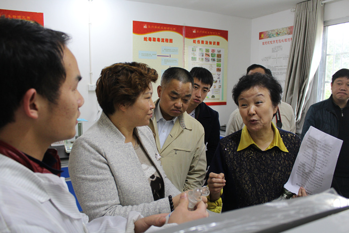董事長(zhǎng)譚群英向秦小明一行介紹公司在蛇毒領(lǐng)域的科研成果