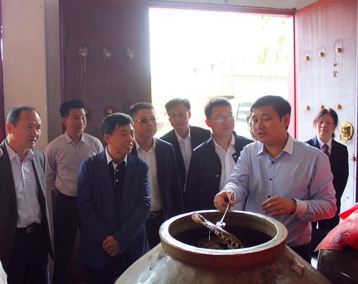 龍建湘一行先后到異蛇科技公司的產(chǎn)品旗艦店、蛇類標(biāo)本陳列室、釀酒車間、健康水產(chǎn)養(yǎng)殖基地、蛇類繁養(yǎng)基地進行實地調(diào)研。公司總經(jīng)理郭德志向龍建湘一行匯報到:“永州市異蛇科技實業(yè)有限公司是永州的一家老牌企業(yè),二十多年,兢兢業(yè)業(yè),把永州異蛇異蛇科技打造成湖南地區(qū)的林業(yè)、農(nóng)業(yè)龍化企業(yè)、同時柳宗元商標(biāo)也成為中國馳名商標(biāo);公司異蛇王酒、異蛇鞭酒采用的是古法釀泡、現(xiàn)代工藝的釀泡方式,我們的工藝目前獲得了湖南省非物質(zhì)文化遺產(chǎn),這也是政府和消費者對我們企業(yè)最大的認可和鼓勵!同時,我們也正與九芝堂、姿采等華南地區(qū)的制藥口化妝品企業(yè)洽談戰(zhàn)略合作!龍建湘聽完后,對公司的現(xiàn)有的發(fā)展模式及方向表示認可,并提出:企業(yè)的發(fā)展需要兩條腿走路,一個是善研發(fā),一個是懂銷售;研發(fā)是公司穩(wěn)步發(fā)展、與時俱進的基礎(chǔ)保障,銷售又是企業(yè)生存的命脈,作為永州獨特實體企業(yè),異蛇科技需要做產(chǎn)品研發(fā)上花心思,在產(chǎn)品銷售方面找突破口,迎難而上。