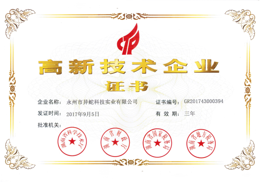 經(jīng)公司申請,湖南省高新技術(shù)企業(yè)認(rèn)定機(jī)構(gòu)辦公室組織專家評審、審查認(rèn)定永州市異蛇科技實(shí)業(yè)有限公司為高新技術(shù)企業(yè)。