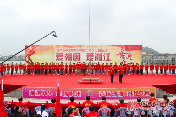 永州新聞網(wǎng)訊(記者 周文君)在祖國即將迎來65華誕之際,9月20日,由湖南電臺News938瀟湘之聲和裕豐祥喜迎天下共同發(fā)起的“愛祖國 愛湘江,國旗接力 喜迎天下”大型公益活動在長沙、湘潭、岳陽、永州四城同步舉行,近萬人在湘江邊齊唱《歌唱祖國》,并通過沿江國旗接力的特別方式宣誓保護湘江、慶祝國慶。永州在濱江廣場舉行了隆重儀式,市委常委、宣傳部長石艷萍致辭并宣布活動開始,市人大常委會副主任袁火林出席。30名志愿者參與國旗傳遞活動,高海波、譚群英、杜宏槐、李玉榮等四名湘江之子代表現(xiàn)場接受訪談。