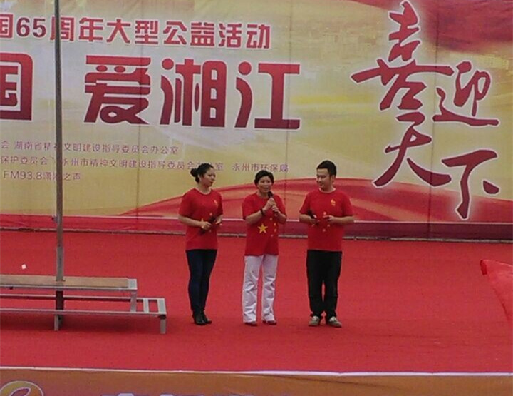 在升旗儀式之后,來自各行各業(yè)的志愿者代表用朗誦、舞蹈、合唱等喜聞樂見的文藝形式呼吁公眾從自身做起,用實際行動“愛祖國、愛湘江”。在永州,近千名志愿者齊聚湘江邊上,其中有學生,機關工作人員以及很多聞訊而來的聽眾,他們在濱江廣場上共同倡議:倡議大家同飲一江水,保護母親河,為子孫留下一江碧水,還原美好綠色的生態(tài);倡議每個人從身邊做起,植樹愛草,保護生態(tài),低碳生活,建立人與自然和諧共存的環(huán)保家園。同時,身處長沙、湘潭、岳陽另外三地的數(shù)千名志愿者也聚集在湘江邊上向國旗莊嚴宣誓,保護湘江,從我做起。在宣誓之后,近萬人還共同唱起了《歌唱祖國》,以此迎接國慶的到來。四地的活動通過現(xiàn)場大屏幕實現(xiàn)了實時互動,壯觀的場面震撼人心、莊嚴的宣誓聲和歌聲響徹云霄,久久回蕩在湘江兩岸。